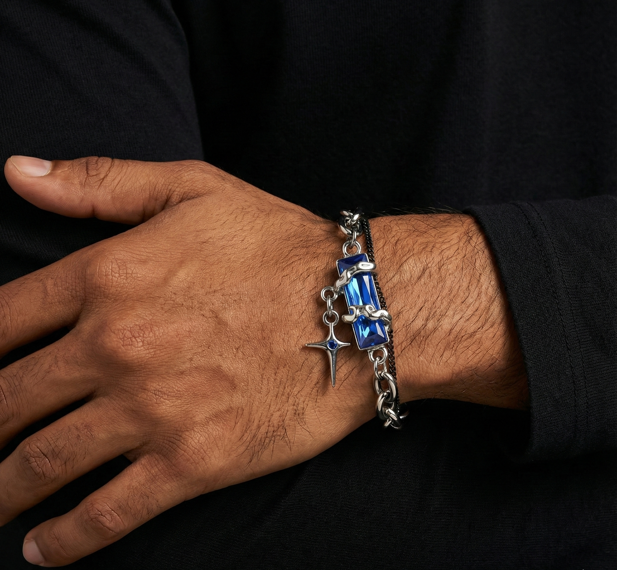 The Rugged Nebula Bracelet is a striking statement piece that merges industrial strength with cosmic elegance. This design features a heavy-duty, multi-layered chain construction, blending polished stainless steel links with a dark, textured secondary chain for a masculine, layered look.